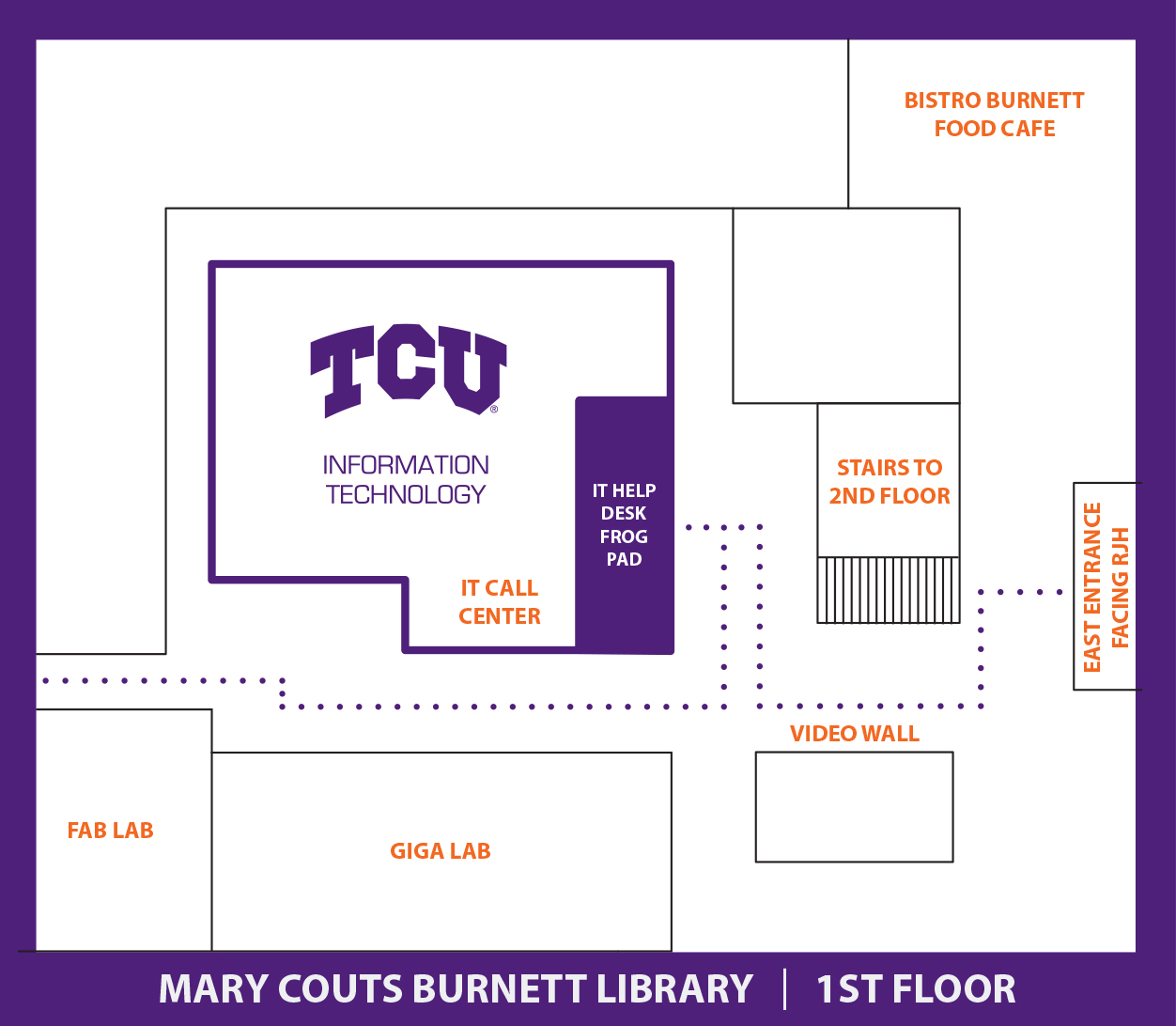 FrogPad is located on the first floor of the Mary Couts Burnett Library on the East side of the building (next to Rees-Jones Hall).